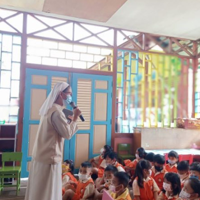 Sabtu, 26 Maret 2022 Suster dan dewan guru bersama anak-anak melakukan doa bersama di Aula Paroki setelah itu mendengarkan cerita